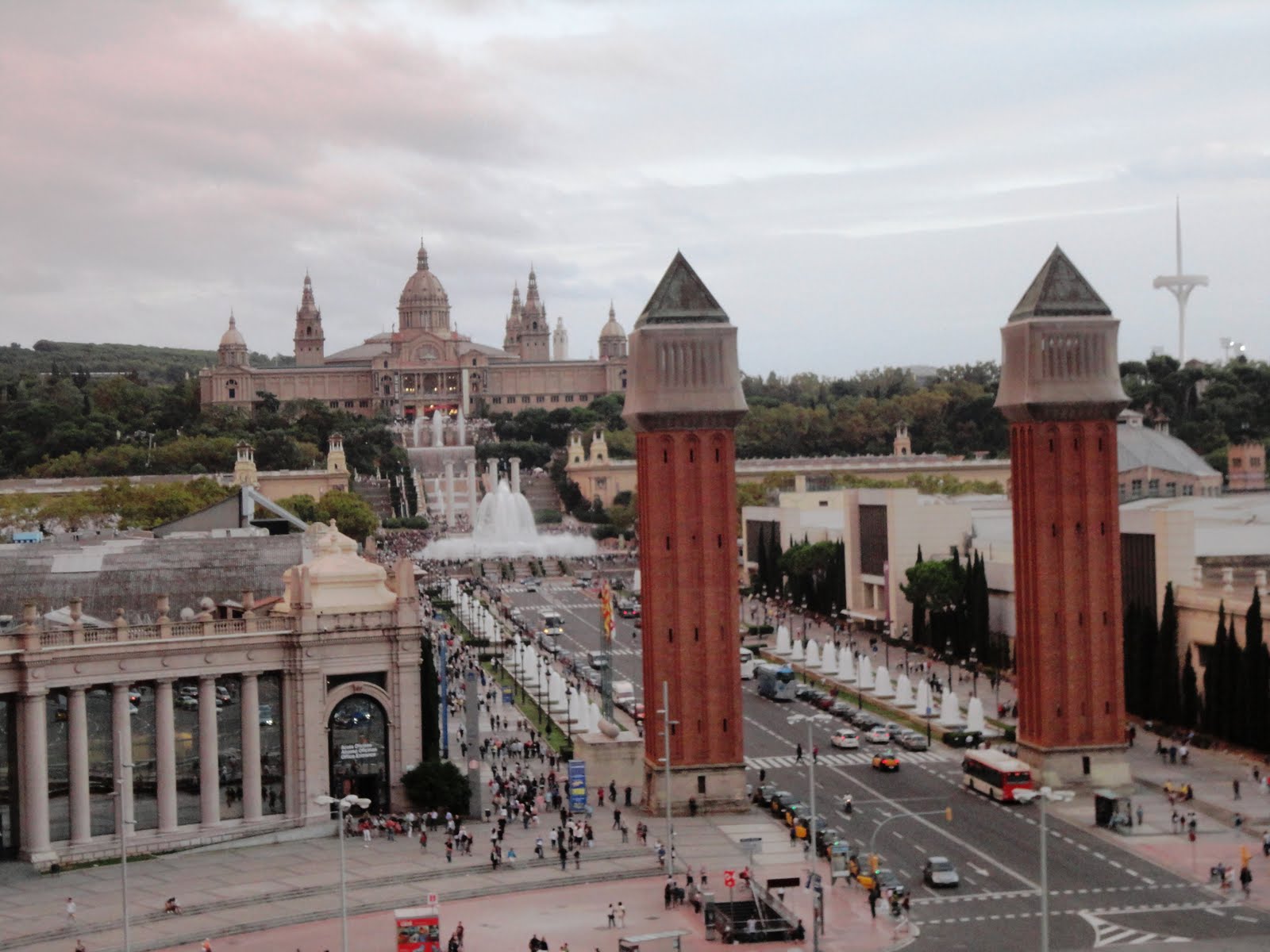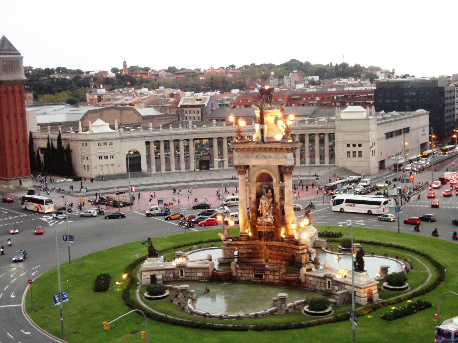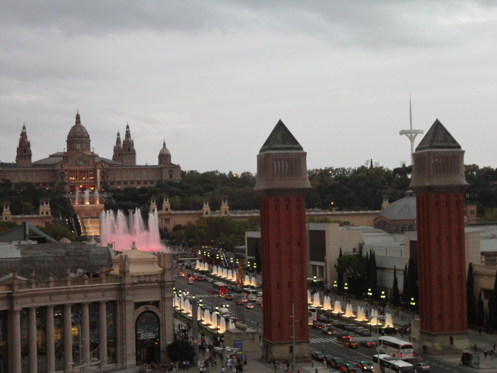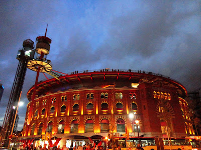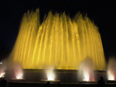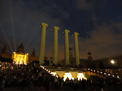 Tal como combinado no final do 3º dia, sexta-feira, voltamos a Montjuic para ver o espectáculo da fonte mágica. Começamos por vê-lo do cimo do shopping Las Arenas que nos permite ter uma panorâmica fantástica da Praça de Espanha, do Castelo e Fonte de Montjuic.